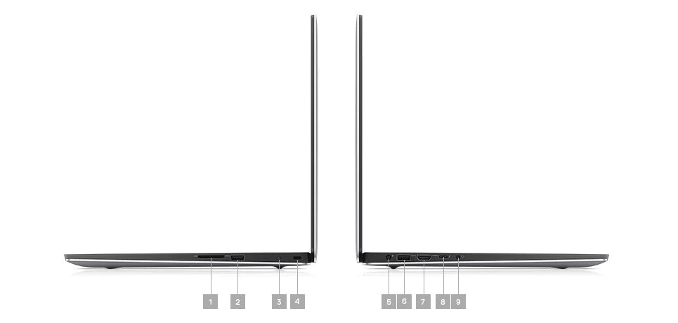 1. Đầu đọc thẻ SD | 2. Cổng USB 3.1 Gen 1 với PowerShare | 3. Nút trạng thái pin | 4. Khe khóa cao quý | 5. Cổng bộ điều hợp nguồn | 6. Cổng USB 3.1 Gen 1 với PowerShare | 7. HDMI 2.0 | 8. Thunderbolt ™ 3 Loại C ™ | 9. Jack Tai nghe
